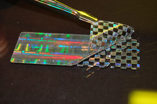 Materiali costruiti con un processo di metalizzazione che rende evidente il tentativo di manomissione attraverso la frammentazione dell'immagine olografica.