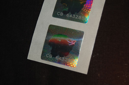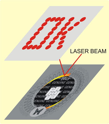 Asportazione selettiva del metallo per scrivere dati variabili permanenti sul sigillo olografico.